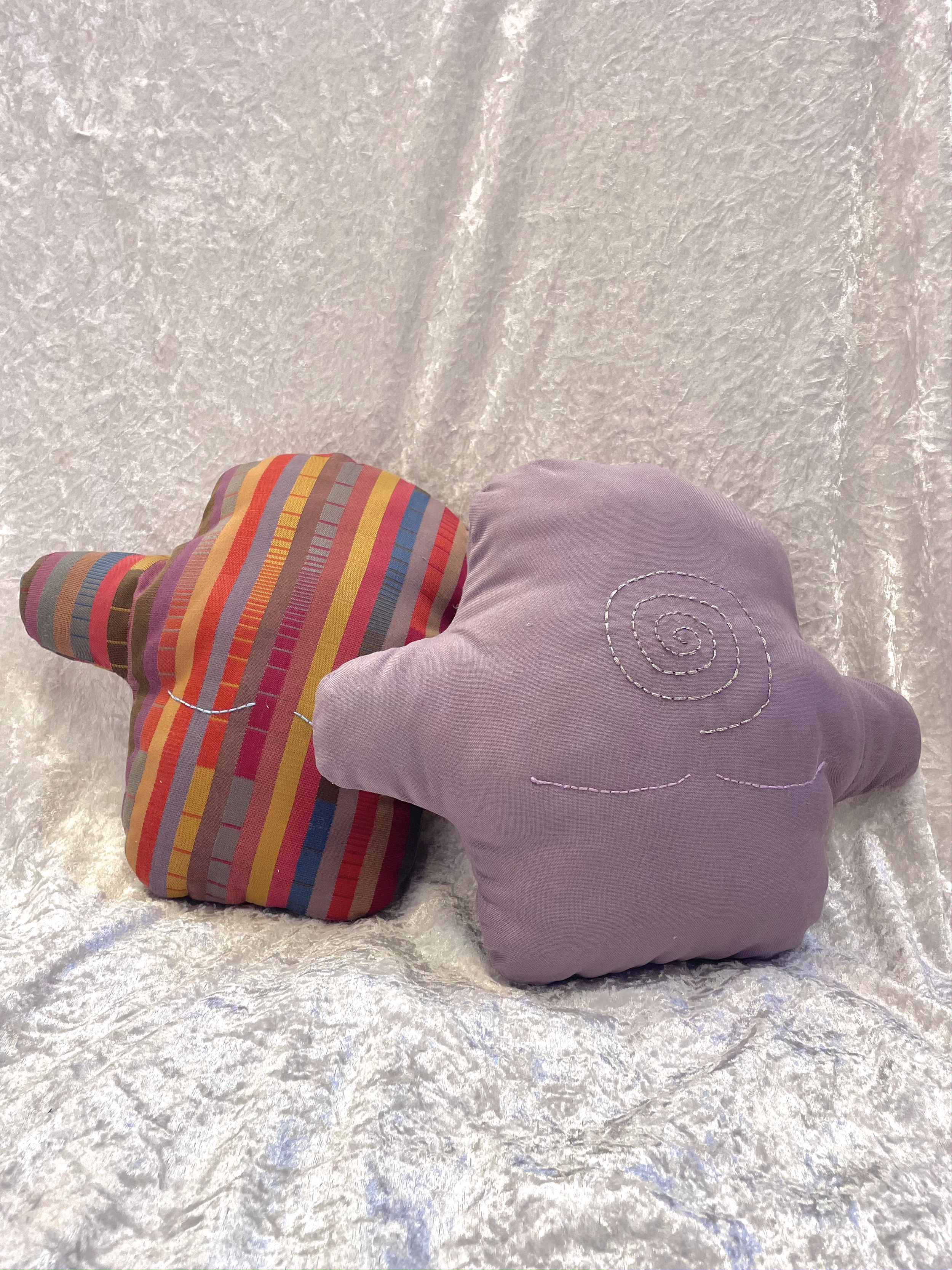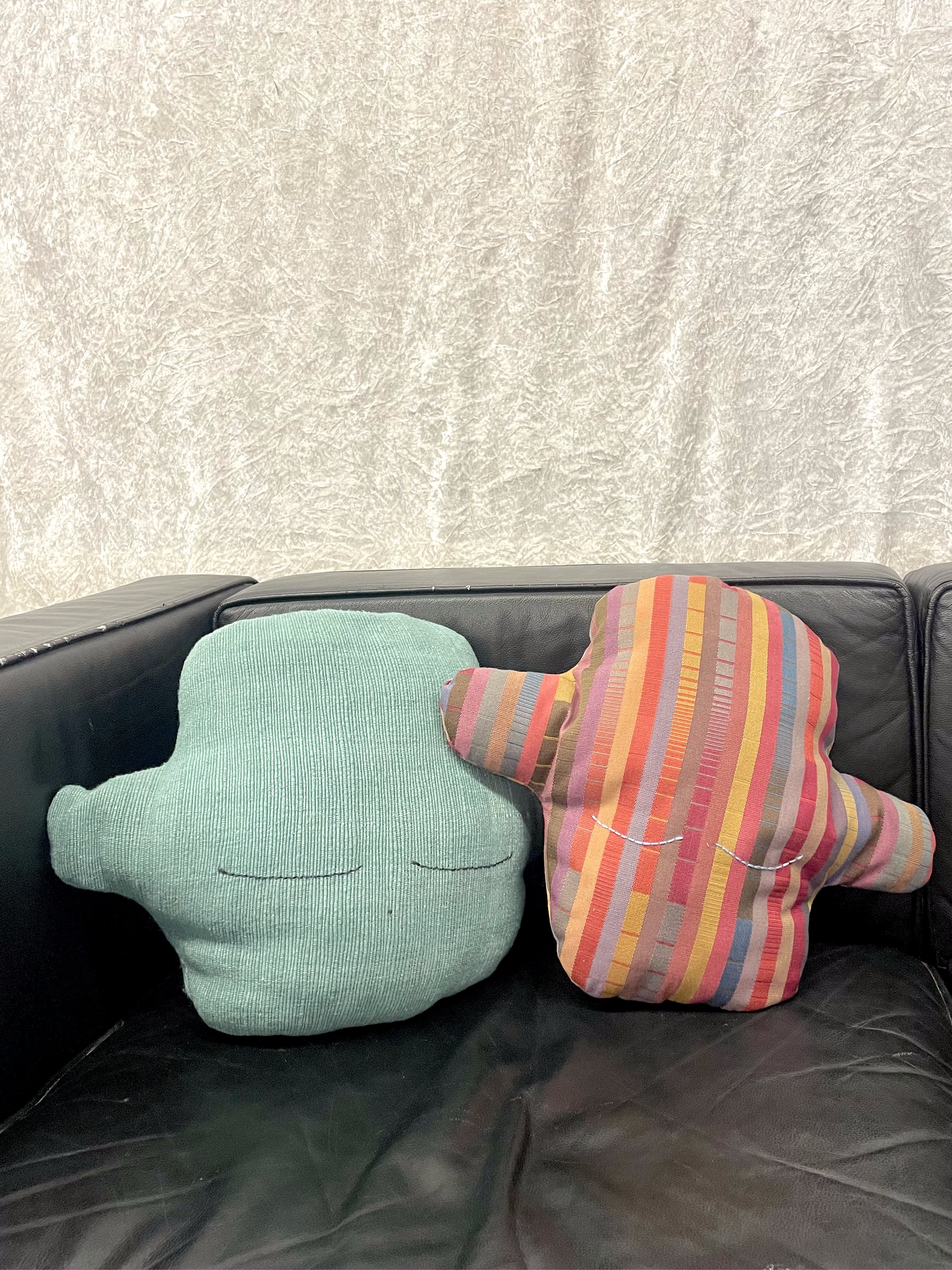 Each pillow is a soft sculpture, handmade from recycled fabrics and embroidered and stuffed with Love.